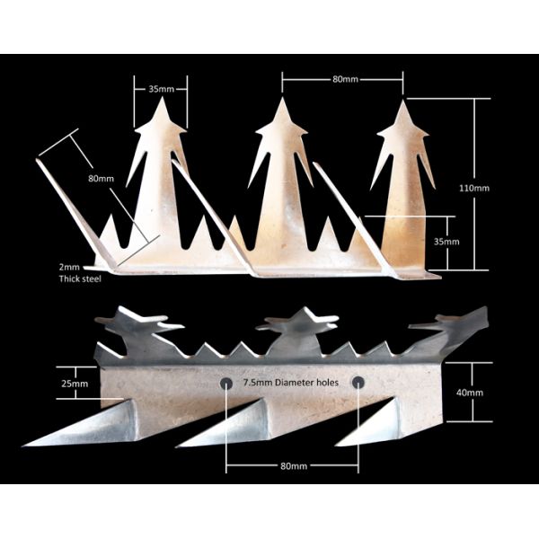The three dimensional design provides greater volume, superior strength and an excellent physical and psychological barrier. Razor Spike 11 is manufactured from 1.6mm steel and is heavily ribbed during the manufacturing process to ensure ultimate strength and sharpness. Razor Spike 11 is 11cm high and consists of two rows of wall spikes. The outer row of wall spikes is barbed and provides a continuous row of spikes angled outwards which will overhang the edge of the structure to which it is attached. The inner wall spike is a thinner stiletto shaped ribbed spike that will penetrate a boot or similar object.